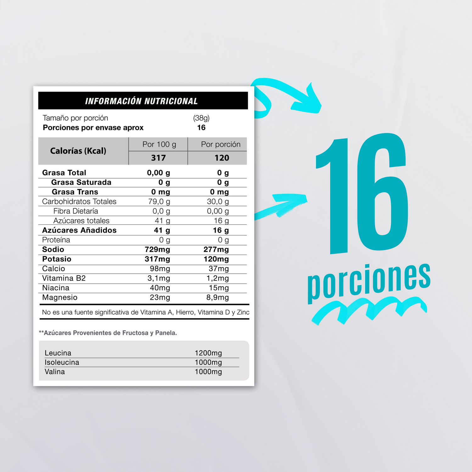 Disuelve una porción (38 g) en 500 ml de agua por cada 2 horas de entrenamiento. Toma pequeños sorbos cada 10 a 15 minutos durante toda la sesión para asegurar una hidratación y aporte energético constantes.